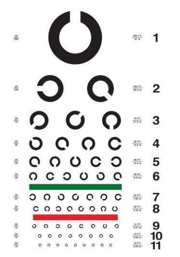 但是,需要說明的是“E表”并不是所有國家都在用。如美國現(xiàn)在還在沿用的“Snellen chart”它是由各種拉丁字母組成的,是最初版本的視力表。日本采用的蘭德特環(huán)行視力表又常被叫做“C表”。C表”也是我國飛行員,招收所所采用的標(biāo)準(zhǔn)。
