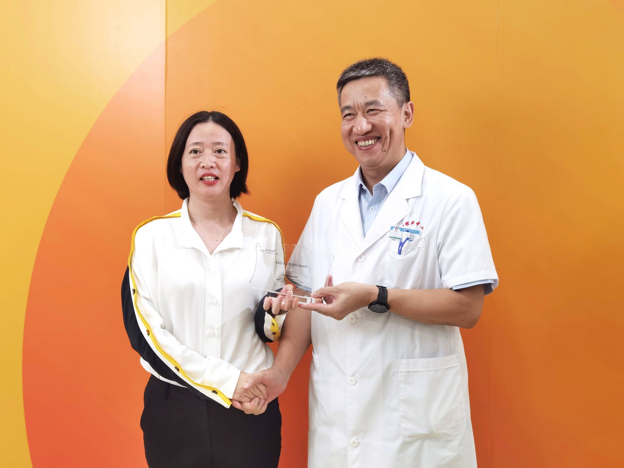 9月22日下午,EVO ICL官方研發(fā)機(jī)構(gòu)STAAR Surgical公司代表為廈門眼科中心業(yè)務(wù)副院長(zhǎng)、ICL核心專家委員會(huì)首屆委員劉才遠(yuǎn)教授頒發(fā)了『EVO ICL 10000 例』獎(jiǎng)?wù)?,以表彰其ICL晶體植入量正式突破10000例。