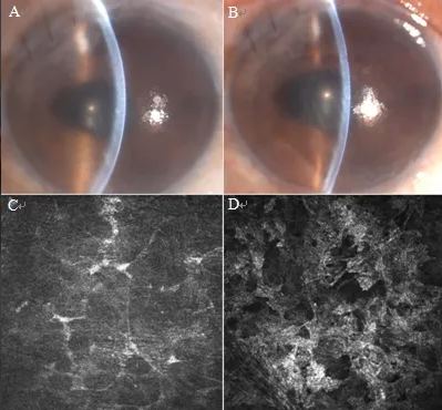真菌性角膜炎是一種由致病真菌引起的、致盲率極高的感染性角膜病。常見的致病菌為曲霉菌,其次為鐮刀菌、白色念珠菌、頭芽胞菌鏈絲菌等??沙霈F(xiàn)免疫環(huán)、衛(wèi)星灶、偽足、菌絲苔被、前方積膿及內(nèi)皮斑。