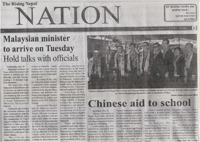臨別前,吳大使對姚曉明博士說,尼泊爾是世界最不發(fā)達(dá)的國家,目前人均收入不到700美元,老百姓的生活相當(dāng)貧困,特別是其北部靠近中國邊境的喜馬拉雅山區(qū)域交通不便,醫(yī)療資源緊缺,這里的尼泊爾人民特別希望分享中國友鄰的經(jīng)濟(jì)發(fā)展成果。尼泊爾歷屆政府都堅(jiān)持一個中國的原則,不允許任何勢力利用尼泊爾從事反華和藏獨(dú)活動。同時,我國也支持尼泊爾人民維護(hù)他們的主權(quán)和領(lǐng)土完整,兩國人民相互支持。我希望廈門眼科中心集團(tuán)的醫(yī)療專家能常來這里開展慈善活動,為尼泊爾人民送去光明,也為中國的安定作出貢獻(xiàn)。我們大使館將為慈善活動提供全力協(xié)助。