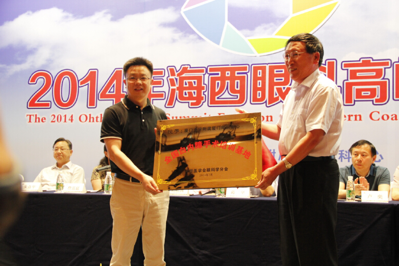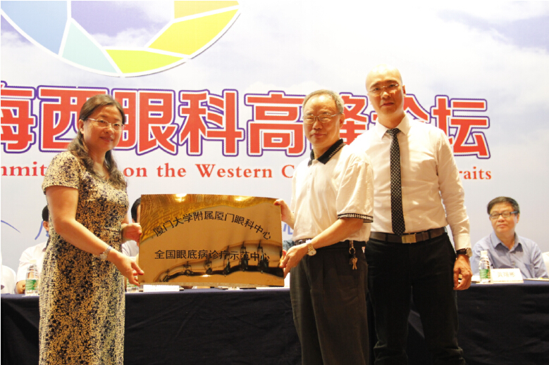 下午15:00,論壇為廈門大學(xué)附屬廈門眼科中心被授予“全國白內(nèi)障手術(shù)培訓(xùn)基地”及“全國眼底COE示范中心”舉行了簡(jiǎn)短而隆重的掛牌儀式。“全國白內(nèi)障手術(shù)培訓(xùn)基地”牌匾由中國防盲技術(shù)指導(dǎo)組副組長徐國興教授代表中華醫(yī)學(xué)會(huì)授予廈門眼科中心白內(nèi)障???,以表彰和肯定廈門眼科中心在白內(nèi)障手術(shù)培訓(xùn)方面所具備的優(yōu)越條件和豐富經(jīng)驗(yàn)。隨后,北京大學(xué)公共衛(wèi)生學(xué)院流行病與衛(wèi)生統(tǒng)計(jì)學(xué)系副主任詹思延為廈門眼科中心眼底病??祁C發(fā)了“全國眼底COE示范中心”牌匾。