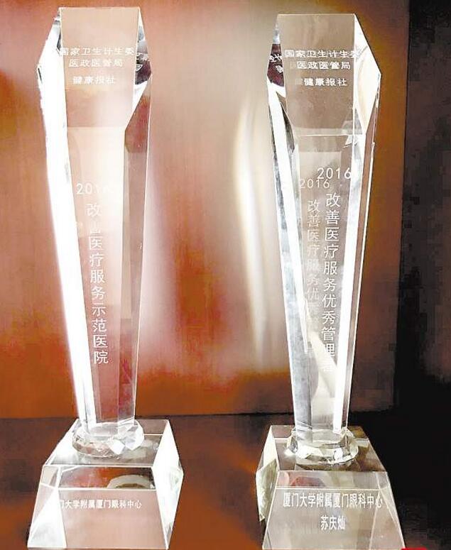 國(guó)家衛(wèi)計(jì)委和健康報(bào)頒發(fā)給廈門(mén)眼科中心的獎(jiǎng)杯。