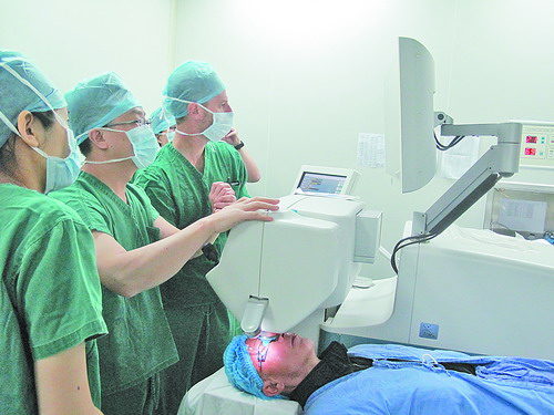 張廣斌主任(中)使用飛秒超乳設備為患者做白內障手術