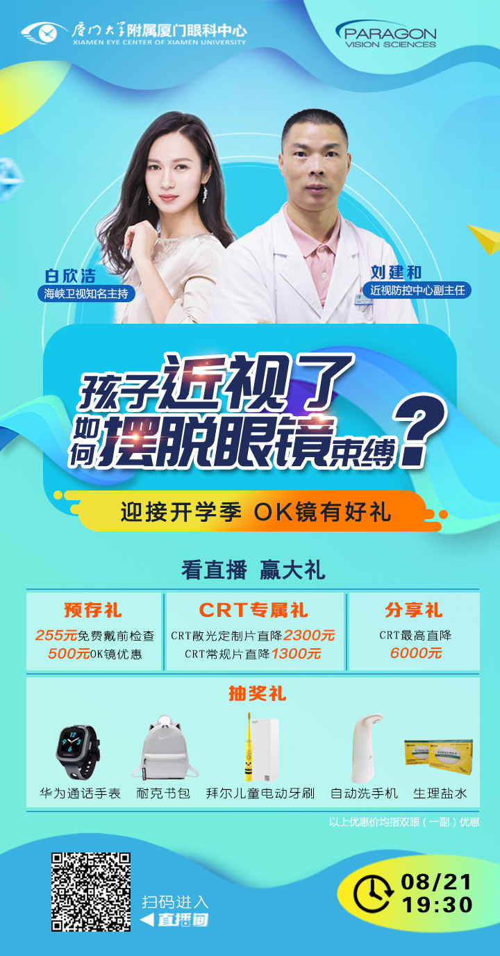 直播現(xiàn)場廈門大學(xué)附屬廈門眼科中心近視防控中心副主任劉建和將為您帶來近視防控的小妙招,并展開OK鏡原理互動(dòng)介紹、OK鏡真人試戴效果實(shí)測以及OK鏡佩戴全過程分享,直播現(xiàn)場更有OK鏡驗(yàn)配大禮包等你來享。