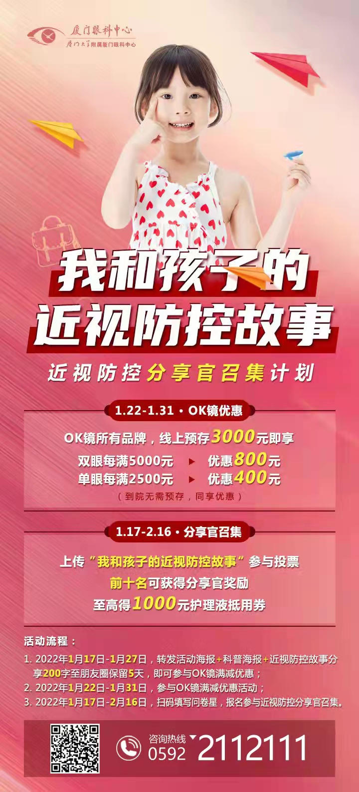 轉(zhuǎn)發(fā)活動(dòng)海報(bào)+科普海報(bào),并分享近視防控故事(不少于200字)至朋友圈保留5天,即可解鎖福利二優(yōu)惠。(開(kāi)頭需帶話題#我和孩子的近視防控故事)活動(dòng)時(shí)間:2022年1月17日-1月27日