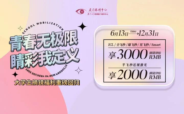 為了幫助更多近視朋友擺脫眼鏡, 廈門眼科中心近期開展了諸多近視手術活動,快來看看有沒有適合你的那一種 。