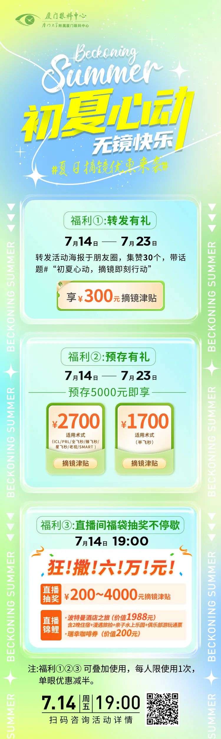 7月14日至7月23日,預(yù)存5000元,PRL/ICL/全飛/臻飛秒/星飛秒/smart/老視手術(shù)即享 2700元 摘鏡津貼;半飛秒享 1700元 摘鏡津貼。