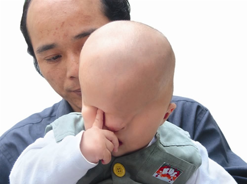 剛滿1周歲的小旭生下來就沒有眼睛,一張臉很令人吃驚——眼部凹陷,像是兩個眼窩,眼部只有完整而光滑的皮膚,沒有眉毛,也沒有睫毛,鼻子像一個小蘿卜頭似的,杵在臉盤中央。