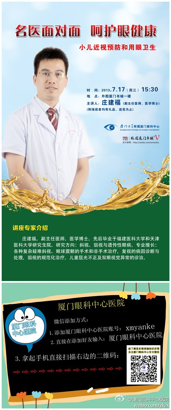 【文章導(dǎo)讀】2013年7月17日15:30分,廈門(mén)眼科中心小兒眼科莊建福博士將在外圖廈門(mén)書(shū)城一樓免費(fèi)為青少年講述如何預(yù)防近視。現(xiàn)場(chǎng)將還有免費(fèi)禮品贈(zèng)送。