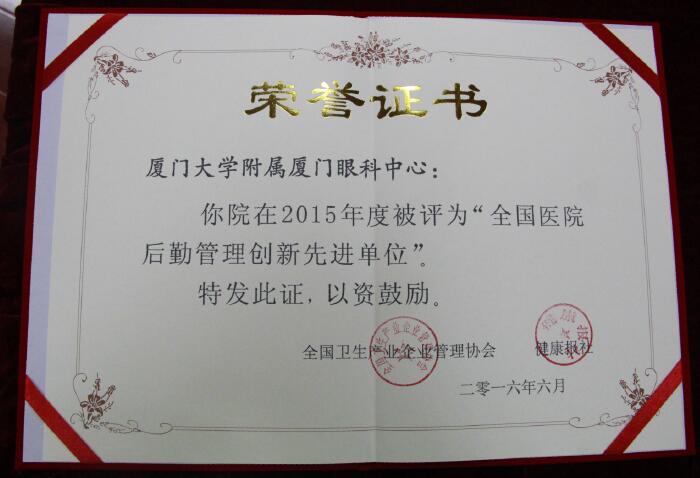 為積極配合醫(yī)藥衛(wèi)生體制改革,進(jìn)一步調(diào)動(dòng)醫(yī)院后勤改革與發(fā)展的積極性,推進(jìn)全國(guó)醫(yī)院后勤建設(shè)的全面提升和發(fā)展,在國(guó)家衛(wèi)生計(jì)生委醫(yī)療管理服務(wù)中心、國(guó)家衛(wèi)計(jì)委醫(yī)院管理研究所的指導(dǎo)組織下,全國(guó)衛(wèi)生產(chǎn)業(yè)企業(yè)管理協(xié)會(huì)與健康報(bào)社聯(lián)合開(kāi)展了“2015年度全國(guó)醫(yī)院后勤管理創(chuàng)新先進(jìn)單位”評(píng)選活動(dòng)。經(jīng)過(guò)嚴(yán)格的初審、評(píng)審、公示、終審,廈門(mén)大學(xué)附屬?gòu)B門(mén)眼科中心獲此殊榮。我院在醫(yī)院后勤管理創(chuàng)新方面成效顯著,得到了衛(wèi)生相關(guān)部門(mén)的肯定與表彰。