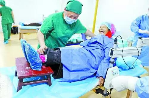 在西藏察隅,醫(yī)療隊(duì)拿來小凳子幫駝背的高齡藏民墊起腳,使其順利接受白內(nèi)障手術(shù)