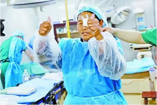 西藏察隅送光明時(shí),藏民在接受白內(nèi)障手術(shù)后,對(duì)現(xiàn)場(chǎng)醫(yī)務(wù)人員豎起大拇指表示感謝