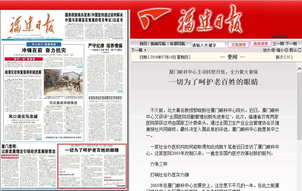 近日,福建日報記者前往廈門眼科中心,對這家作為改制典范的醫(yī)院進行了深入采訪。7月14日,福建日報頭版刊登了報道,特別對廈門眼科中心改制以來的轉型升級、醫(yī)療服務和人才引進等方面的創(chuàng)新舉措給予了高度的肯定。相關文章轉載如下: