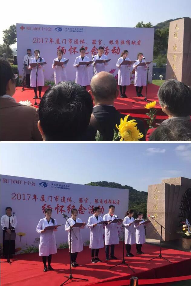 活動(dòng)中,廈門大學(xué)附屬廈門眼科中心醫(yī)務(wù)工作者們帶來了《生命的禮物》的詩朗誦表演,表達(dá)了對(duì)捐獻(xiàn)者無償獻(xiàn)出珍貴“生命禮物”的崇敬與感恩之情。廈門大學(xué)醫(yī)學(xué)院青年志愿者協(xié)會(huì)在紀(jì)念碑前宣誓并遞上了獻(xiàn)花。捐獻(xiàn)者紀(jì)念碑前,手捧白菊的人群中,有蹣跚而行的白發(fā)老人,有一臉稚氣的年幼孩童,更多的是中年人和青年人。人群中,有人哭泣,有人默默佇立,一遍遍撫摸著刻在紀(jì)念碑上親人的名字。