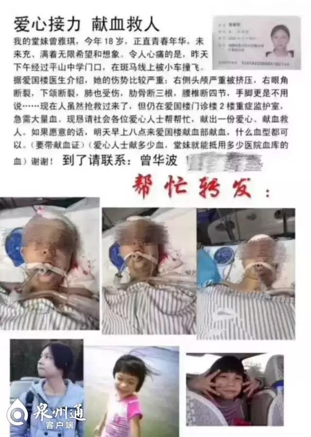 雅琪手術(shù)后第二天,一場關(guān)于她的愛心接力在朋友圈傳開了,一條“愛心接力獻(xiàn)血救人——晉江少女曾雅琪不幸遭遇車禍”的求助信息被眾人轉(zhuǎn)發(fā)。