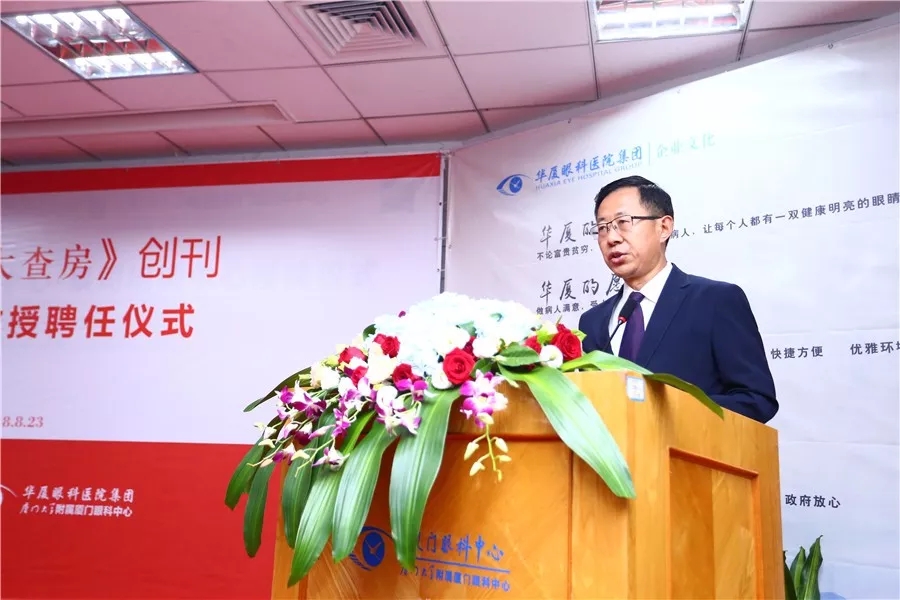 眼科醫(yī)院集團專家委員會趙堪興、華廈眼科醫(yī)院集團副總裁、廈門大學附屬廈門眼科中心執(zhí)行院長李曉峰、廈門大學附屬廈門眼科中心副總經(jīng)理陳昉、廈門大學附屬廈門眼科中心人力資源總監(jiān)李秀容等領導和嘉賓出席了《眼科大查房》雜志創(chuàng)刊暨唐健教授的聘任儀式。儀式由廈門眼科中心副總經(jīng)理姚鄭玲玲主持。