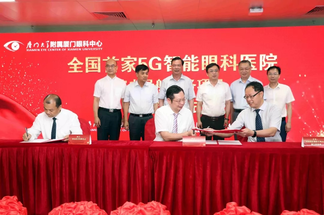 ▲廈門大學附屬廈門眼科中心董事長蘇慶燦與華為移動網(wǎng)絡數(shù)字化集成與運營總經(jīng)理段學鵬、中國電信廈門分公司總經(jīng)理黎樹旺正式簽約“5G智能眼科醫(yī)院”