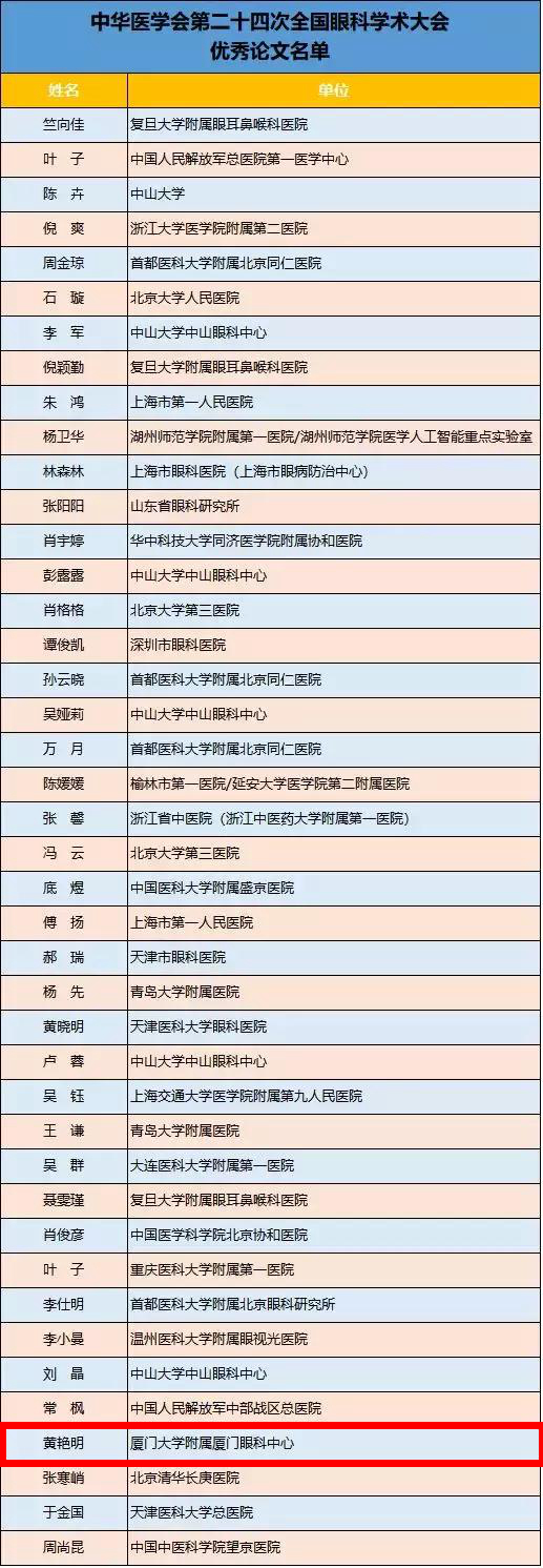 2019年9月8日上午,中華醫(yī)學會第二十四次全國眼科學術大會在蘇州國際博覽中心舉行閉幕儀式。廈門眼科中心眼外傷專科留美博士黃艷明主任發(fā)表的論文《21例眼球貫通傷眶內金屬異物殘留術后長期隨訪觀察》被評為優(yōu)秀論文獎,福建省僅一篇入選。