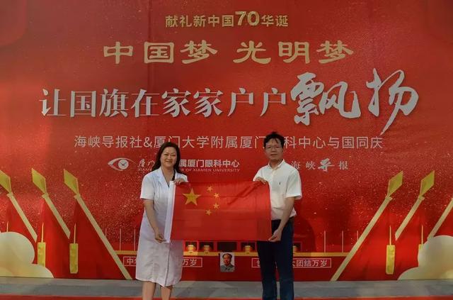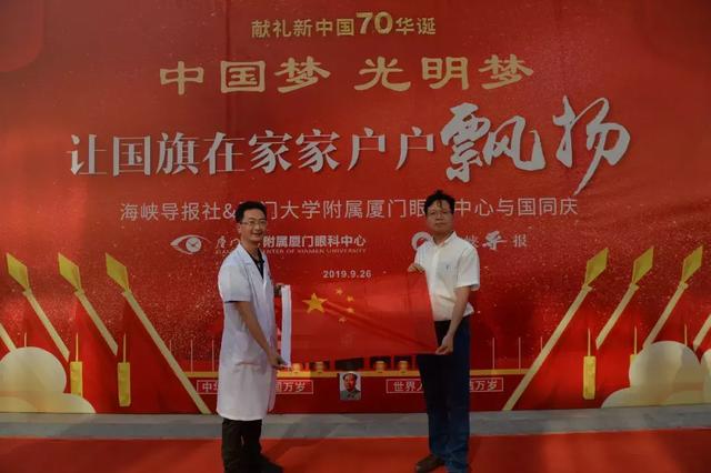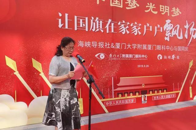 新中國70華誕之際,廈門眼科中心將以高昂的斗志、飽滿的熱情,面向醫(yī)患、面向社會,奉獻愛心,實現(xiàn)“病人滿意、員工滿意、同行認同、社會認同、政府放心”的目標(biāo)!希望在場的黨員同志和群眾能把鮮艷的五星紅旗迎接回家,把一面旗幟、一份責(zé)任、一份擔(dān)當(dāng)帶回家,共祝愿祖國繁榮昌盛。