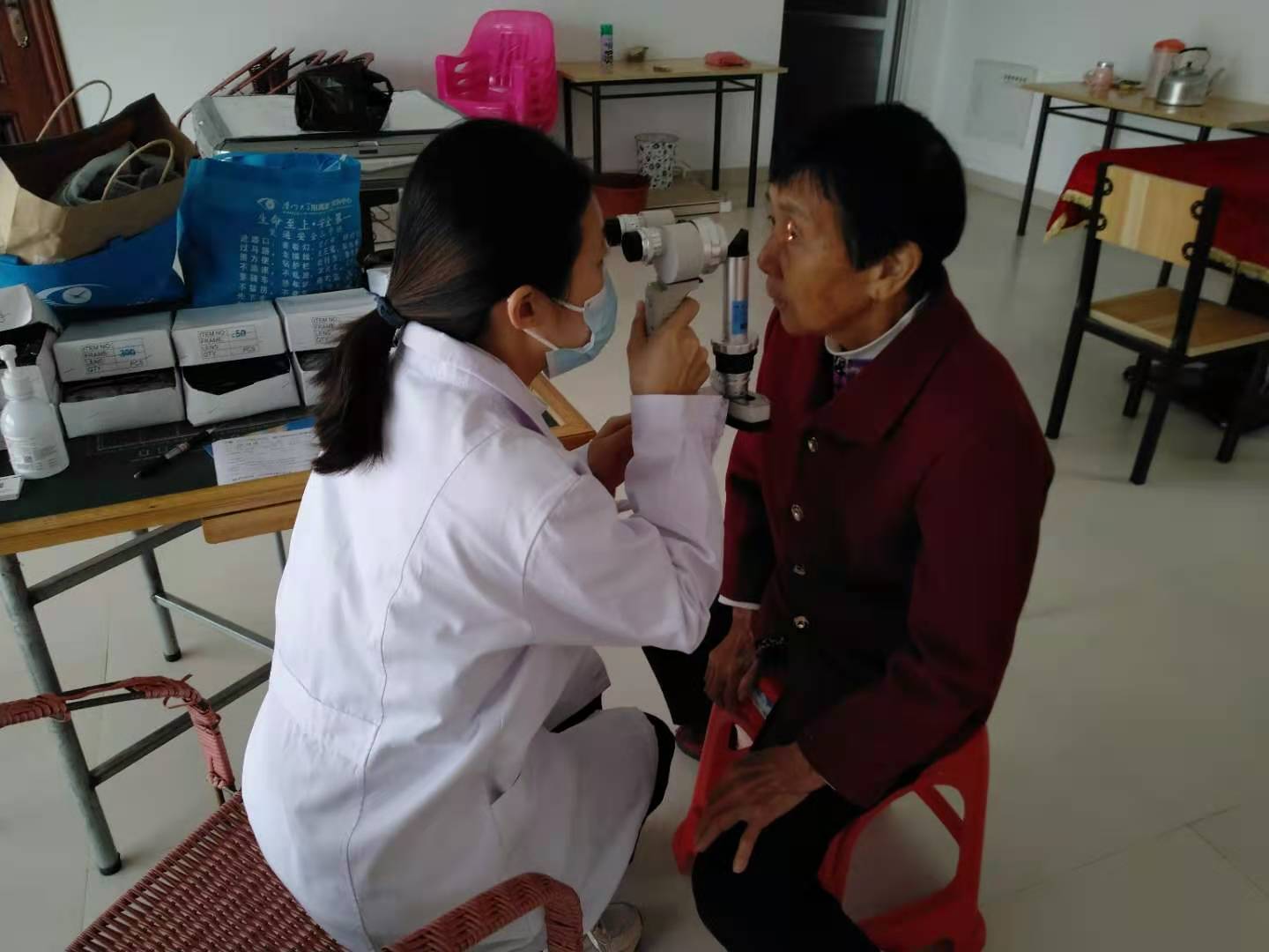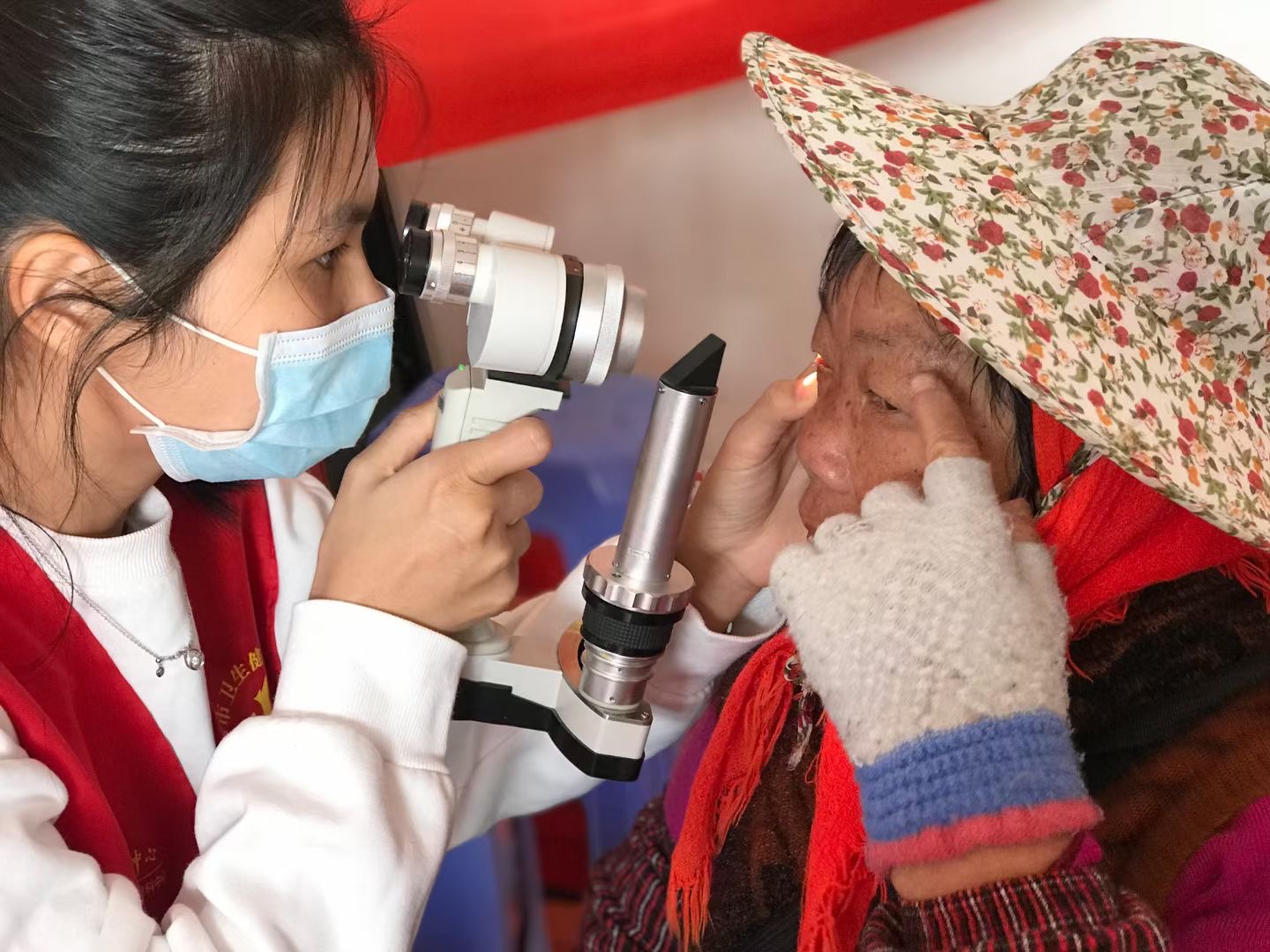 首次測視力的劉奶奶,有些緊張,醫(yī)生們很耐心地告訴她怎么比劃,奶奶很認(rèn)真,高興得像個孩子。隊(duì)伍里,81歲高齡的高奶奶在兒子的勸說下前來檢查,高奶奶的眼睛一年以來漸漸模糊看不清事物,連迎面走來的兒子都經(jīng)常要靠聲音辨認(rèn),“我年紀(jì)大了,出門也不方便,下山去醫(yī)院檢查太麻煩了!”兒子聽說三甲