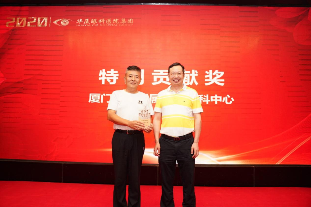▲蘇慶燦先生為廈門大學(xué)附屬廈門眼科中心頒發(fā)2020年屈光項目特別貢獻(xiàn)獎