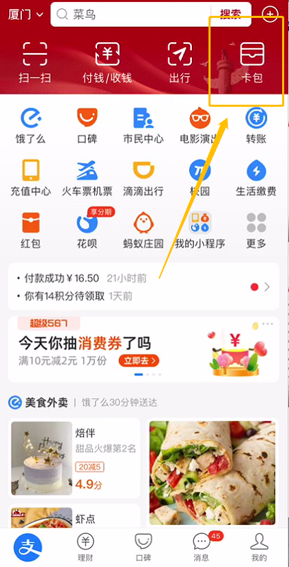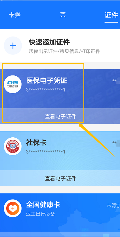 進入支付寶,點擊“卡包”-“證件”-“醫(yī)保電子憑證”