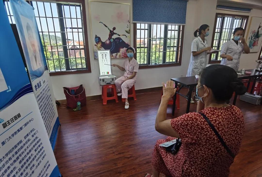 ▲廈門眼科中心護(hù)士為居民查視力