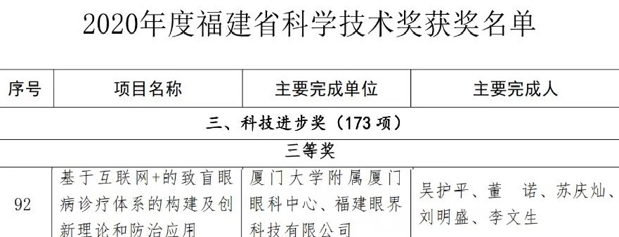 【文章導讀】近日,福建省人民政府發(fā)布《福建省人民政府關(guān)于 2020 年度省科學技術(shù)獎勵的決定》,其中廈門眼科中心憑借“基于互聯(lián)網(wǎng)+的致盲眼病診療體系的構(gòu)建及創(chuàng)新理論和防治應用”項目上榜