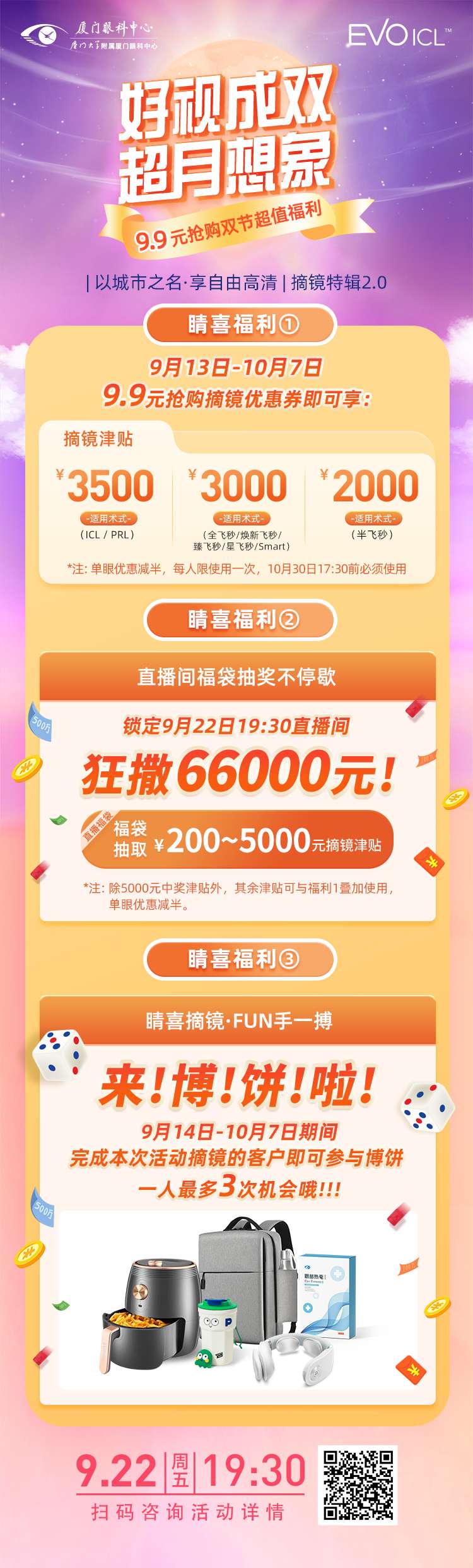 即日起至10月7日,廈門眼科中心9.9元購至高3500元摘鏡津貼,9月22日19:30狂撒66000元福利,更有機(jī)會(huì)抽取錦鯉獎(jiǎng)5000元津貼,活動(dòng)期間完成手術(shù)還能博餅哦~