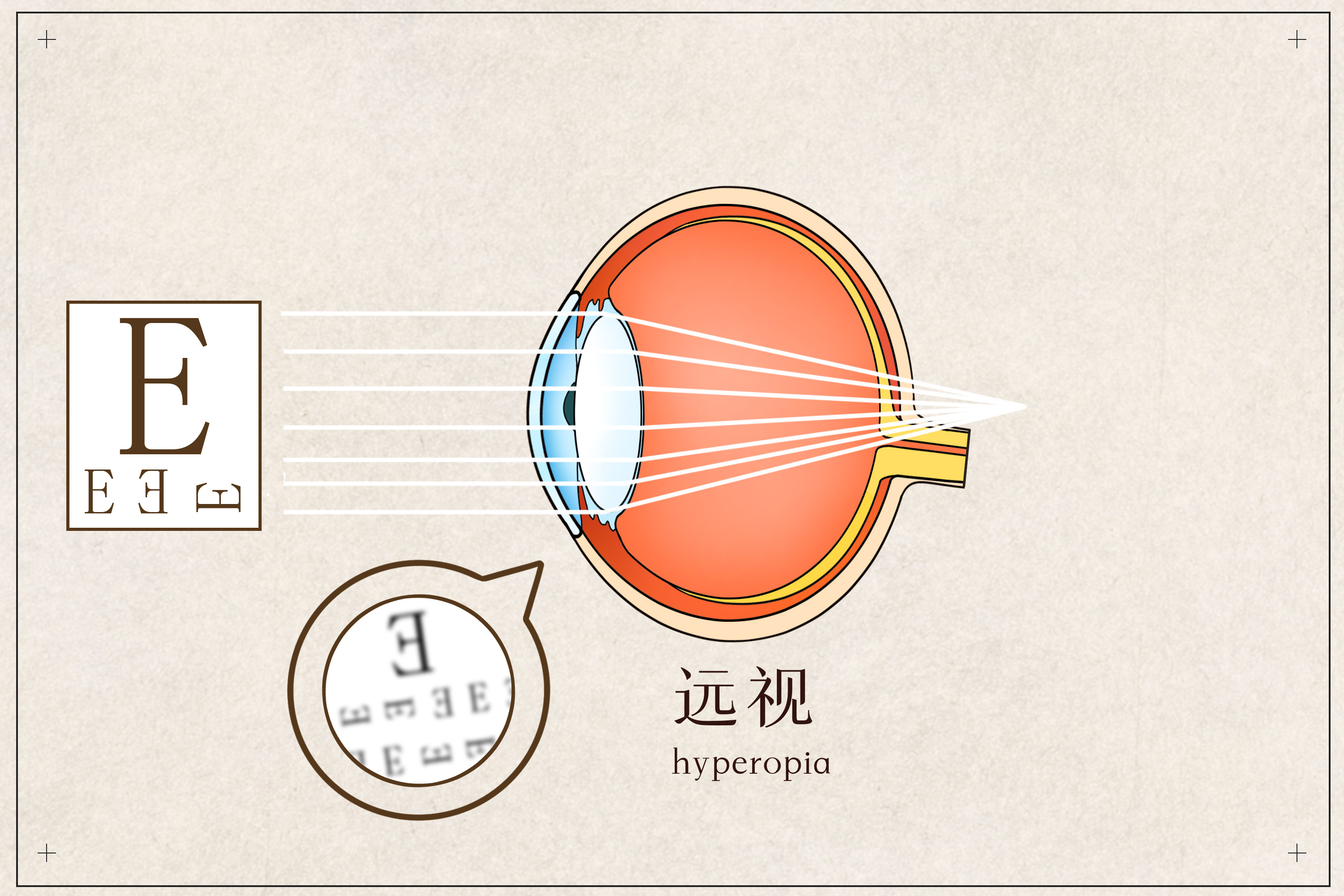 遠視是指平行光線進入眼內(nèi),經(jīng)過眼球屈光系統(tǒng)(角膜、房水、晶狀體、玻璃體)的折射,在視網(wǎng)膜后方聚焦,導(dǎo)致視網(wǎng)膜上的成像模糊不清,稱為遠視眼。